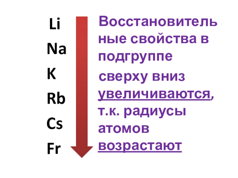 Li       NaKRbCsFrВосстановительные свойства в подгруппе сверху вниз увеличиваются, т.к. радиусы