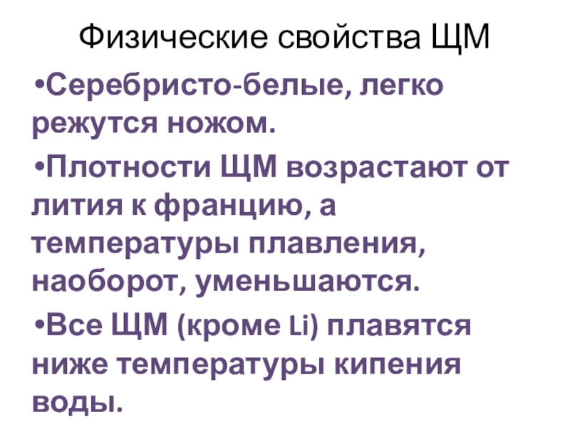 Физические свойства ЩМСеребристо-белые, легко режутся ножом. Плотности ЩМ возрастают от лития к францию, а температуры плавления, наоборот,