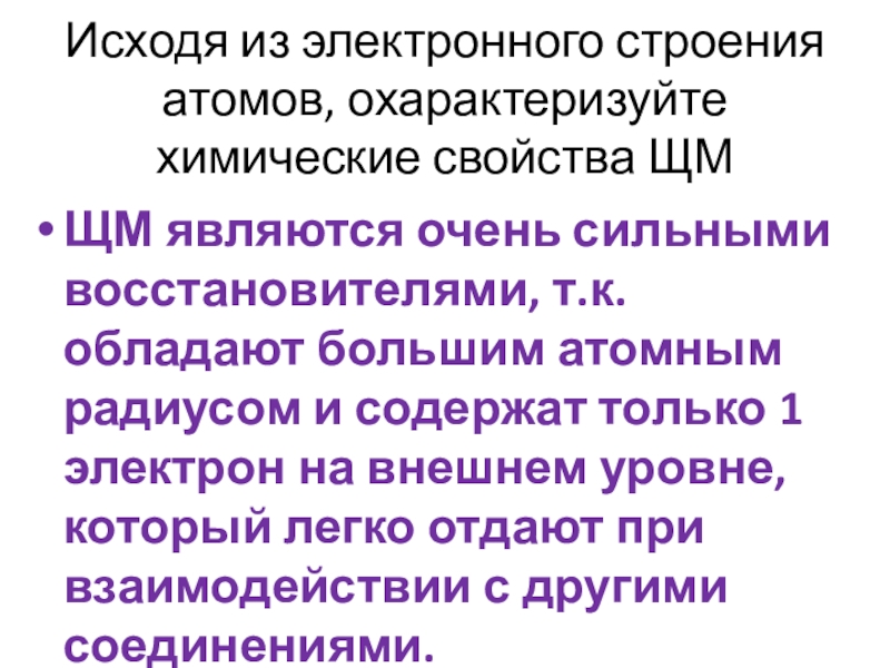 Слайд 13Исходя из электронного строения атомов, охарактеризуйте химические свойства ЩМ