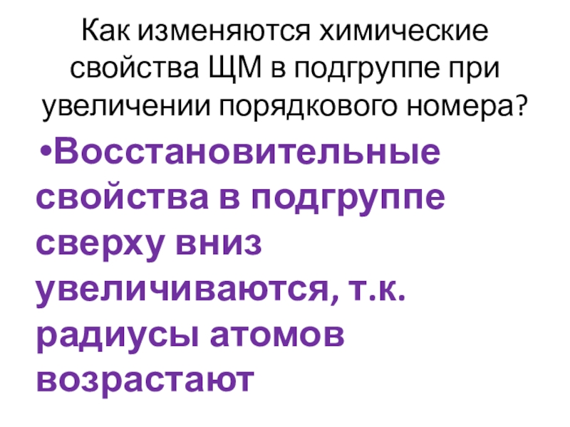 Слайд 14Как изменяются химические свойства ЩМ в подгруппе при увеличении порядкового номера?