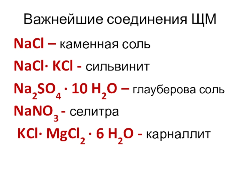 Важнейшие соединения ЩМNaCl – каменная сольNaCl∙ KCl - сильвинитNa2SO4 ∙ 10 H2O – глауберова сольNaNO3 - селитра