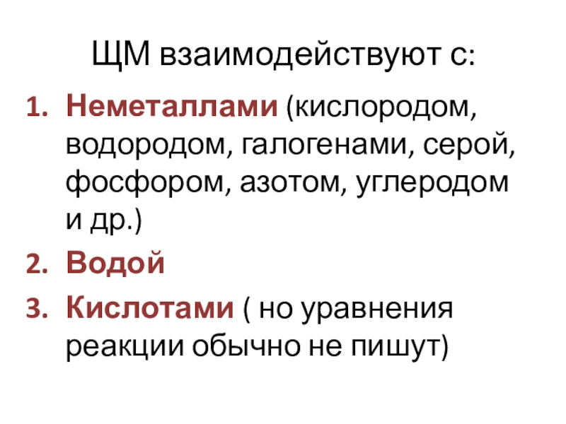 ЩМ взаимодействуют с:Неметаллами (кислородом, водородом, галогенами, серой, фосфором, азотом, углеродом и др.)ВодойКислотами ( но уравнения реакции обычно