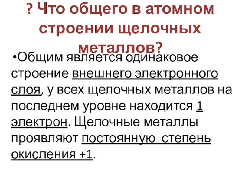 ? Что общего в атомном строении щелочных металлов?Общим является одинаковое строение внешнего электронного слоя, у всех щелочных