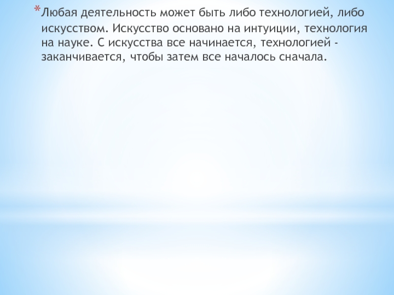 Слайд 2Любая деятельность может быть либо технологией, либо искусством. Искусство основано на