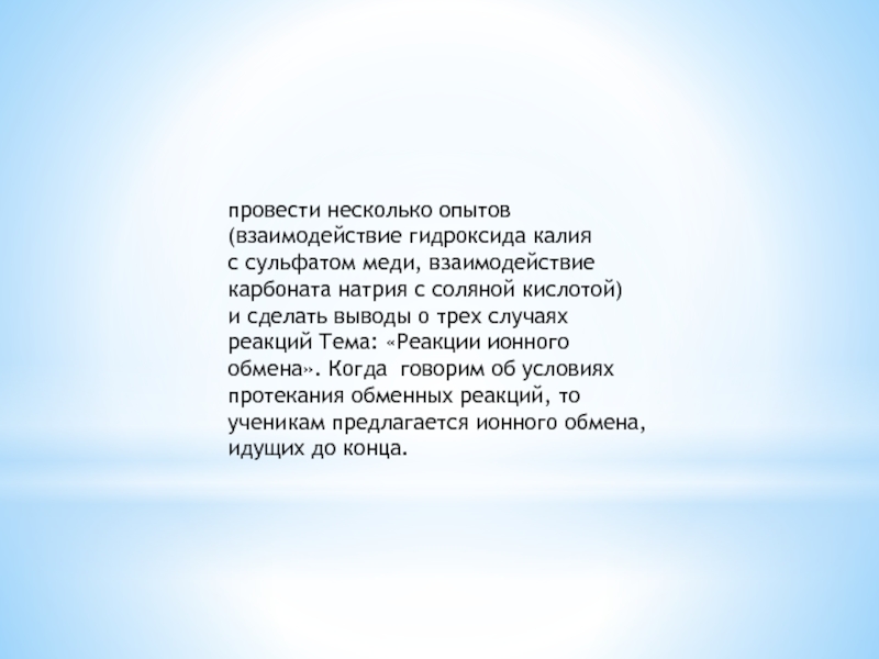 с соляной кислотой) и сделать выводы о трех случаях реакций Тема: «Реакции ионного обмена». Когда говорим об условиях протекания обменных реакций, то ученикам предлагается ионного обмена, идущих до конца.