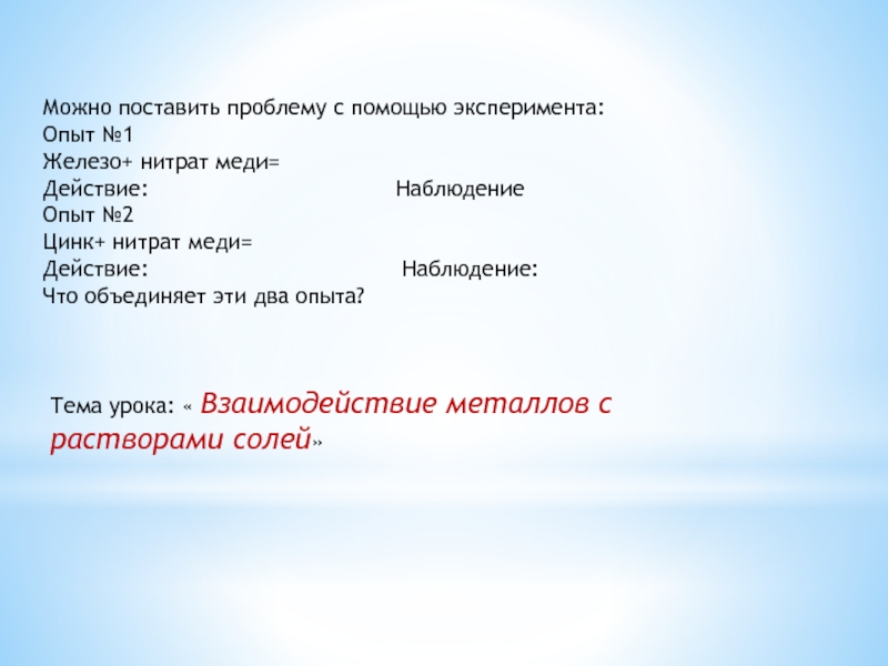 Тема урока: « Взаимодействие металлов с растворами солей»