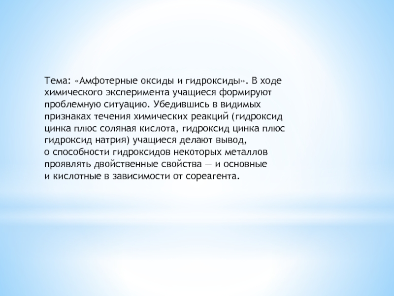 Слайд 40Тема: «Амфотерные оксиды и гидроксиды». В ходе химического эксперимента учащиеся формируют проблемную ситуацию.