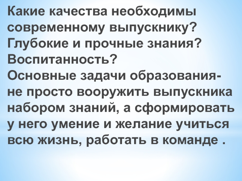 не просто вооружить выпускника набором знаний, а сформировать у него умение и желание учиться всю жизнь, работать в команде .