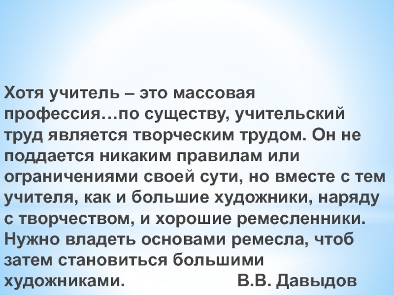 трудом. Он не поддается никаким правилам или ограничениями своей сути, но вместе с тем учителя, как и большие художники, наряду с творчеством, и хорошие ремесленники. Нужно владеть основами ремесла, чтоб затем становиться большими художниками. В.В. Давыдов