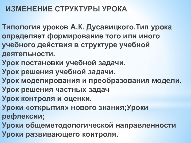 Типология уроков А.К. Дусавицкого.Тип урока определяет формирование того