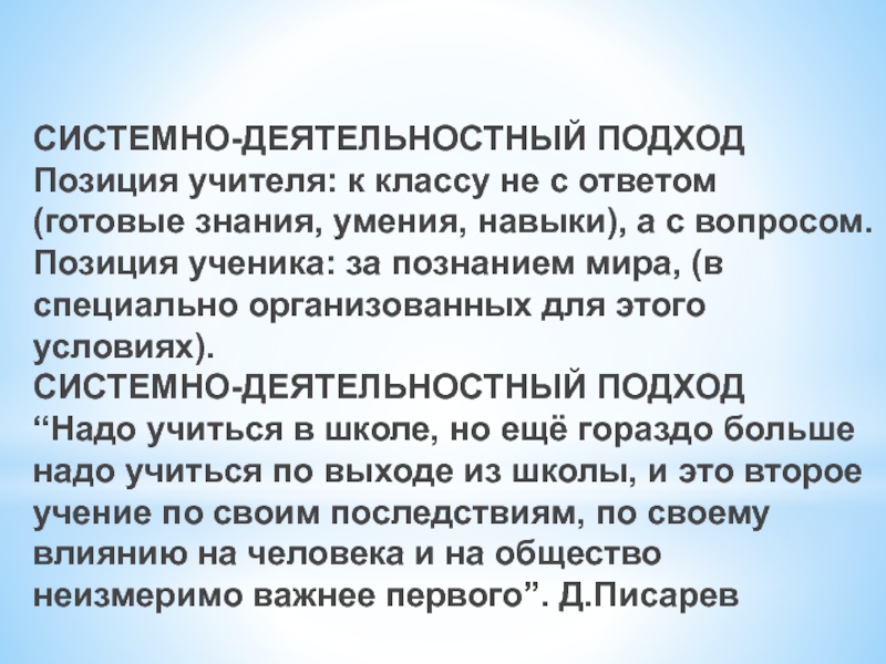 навыки), а с вопросом.Позиция ученика: за познанием мира, (в специально организованных для этого условиях).