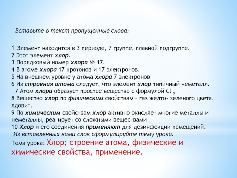 Тема урока: Хлор; строение атома, физические и химические свойства, применение.