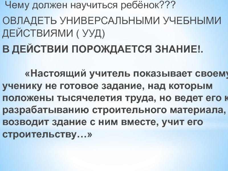 «Настоящий учитель показывает своему ученику не готовое задание, над которым положены тысячелетия труда, но ведет его к разрабатыванию строительного материала, возводит здание с ним вместе, учит его строительству…»