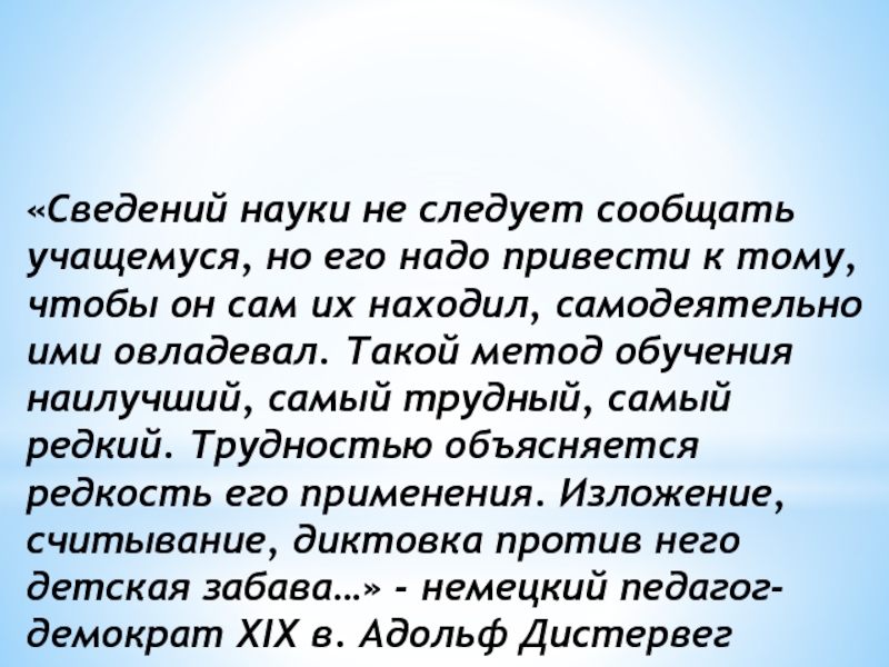тому, чтобы он сам их находил, самодеятельно ими овладевал. Такой метод обучения наилучший, самый трудный, самый редкий. Трудностью объясняется редкость его применения. Изложение, считывание, диктовка против него детская забава…» - немецкий педагог-демократ XIX в. Адольф Дистервег