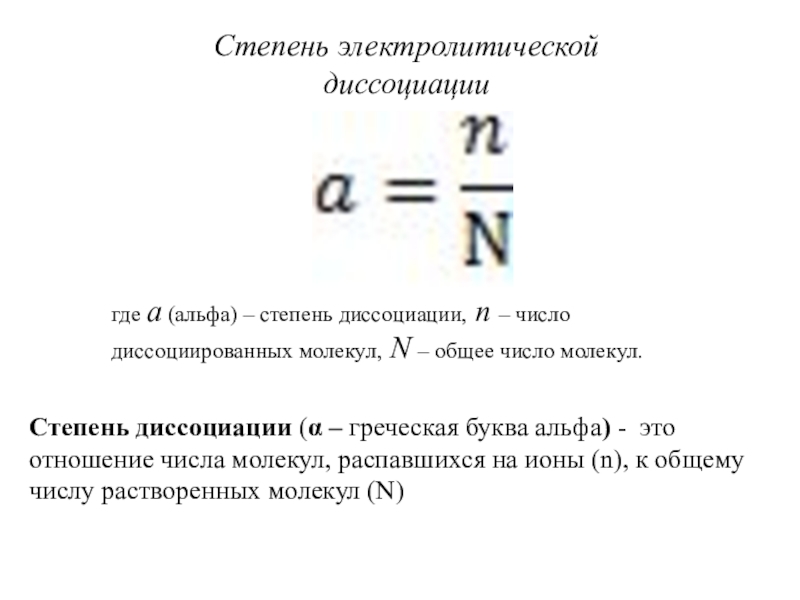 Степень диссоциации (α – греческая буква альфа) - это отношение числа молекул, распавшихся на ионы (n), к общему числу растворенных молекул (N)