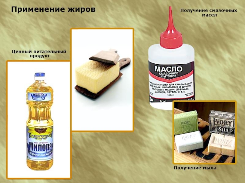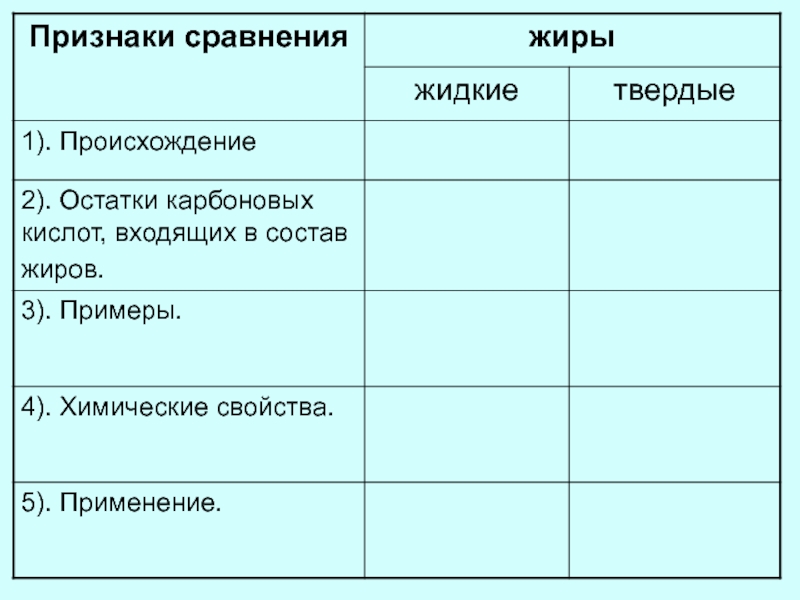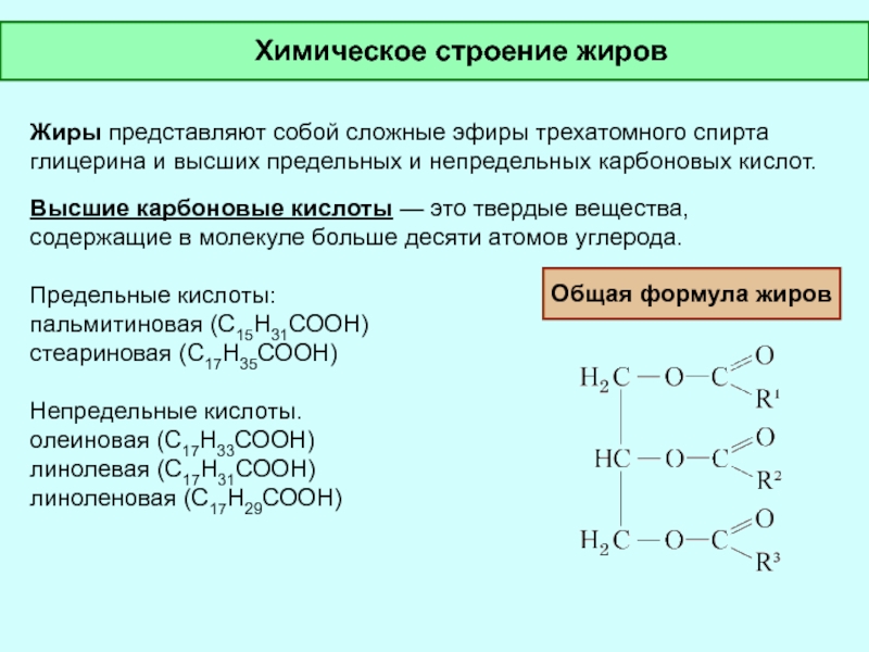 Жиры представляют собой сложные эфиры трехатомного спирта глицерина и высших предельных и непредельных карбоновых кислот. Химическое строение