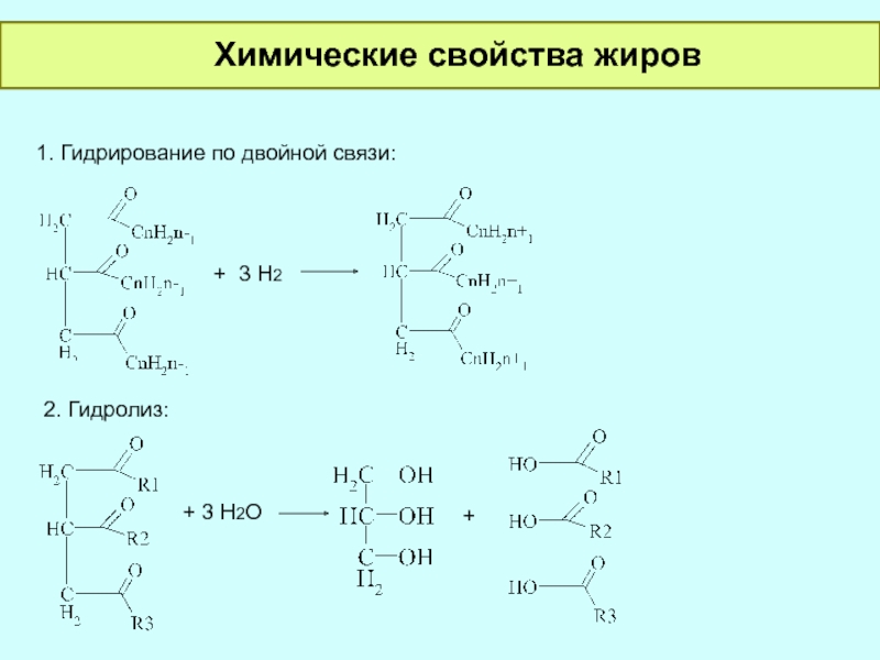 Химические свойства жиров+ 3 H21. Гидрирование по двойной связи:2. Гидролиз:+ 3 Н2О+