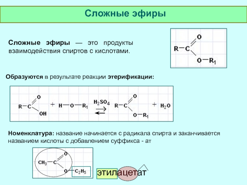 Образуются в результате реакции этерификации:Номенклатура: название начинается с радикала спирта и заканчивается названием кислоты с добавлением суффикса - атэтилацетатСложные эфирыСложные эфиры — это продукты взаимодействия спиртов с кислотами.