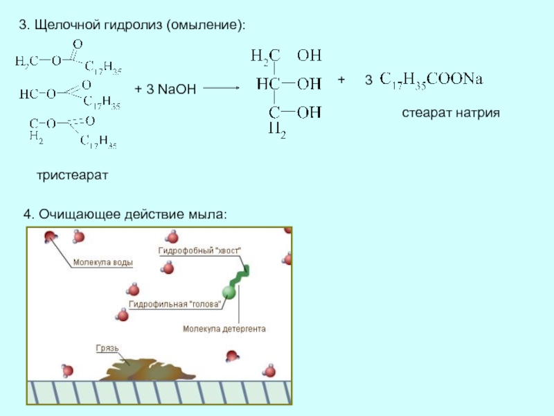 3. Щелочной гидролиз (омыление):+ 3 NaOH+   3тристеаратстеарат натрия4. Очищающее действие мыла: