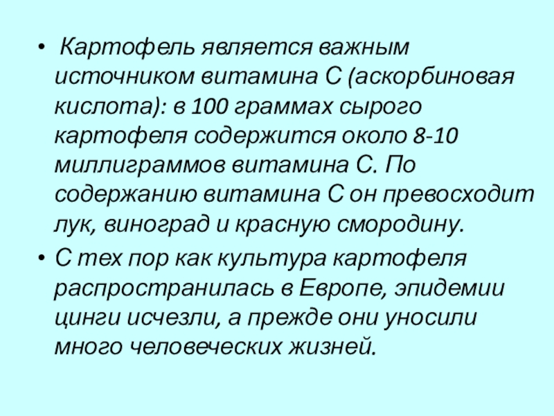 С тех пор как культура картофеля распространилась в Европе, эпидемии цинги исчезли, а прежде они уносили много человеческих жизней.