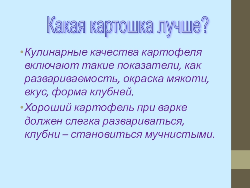 Слайд 14Кулинарные качества картофеля включают такие показатели, как развариваемость, окраска мякоти, вкус,