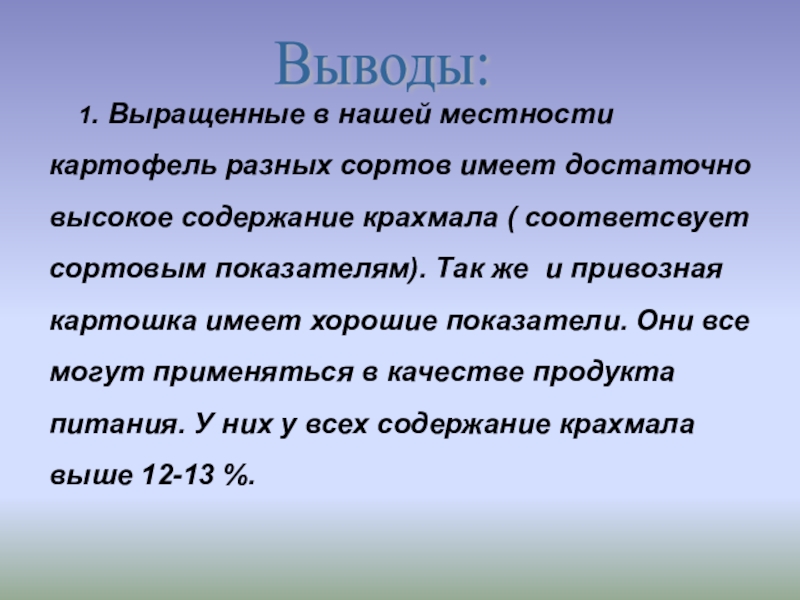 имеет достаточно высокое содержание крахмала ( соответсвует сортовым показателям). Так же и привозная картошка имеет хорошие показатели. Они все могут применяться в качестве продукта питания. У них у всех содержание крахмала выше 12-13 %.