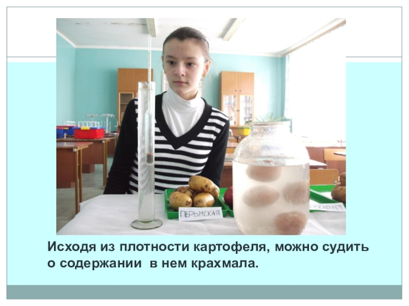 Слайд 18Исходя из плотности картофеля, можно судить о содержании в нем крахмала.