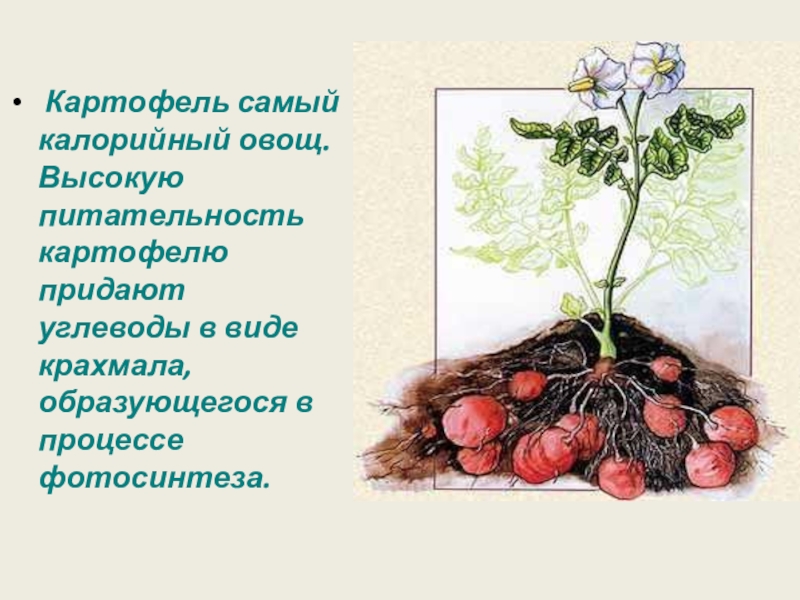 Слайд 10 Картофель самый калорийный овощ. Высокую питательность картофелю придают углеводы в