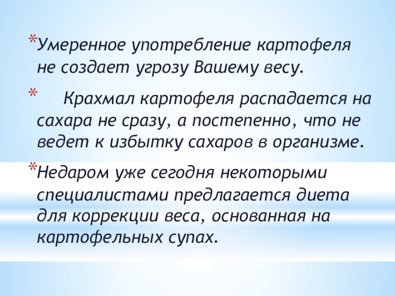 Слайд 13Умеренное употребление картофеля не создает угрозу Вашему весу.