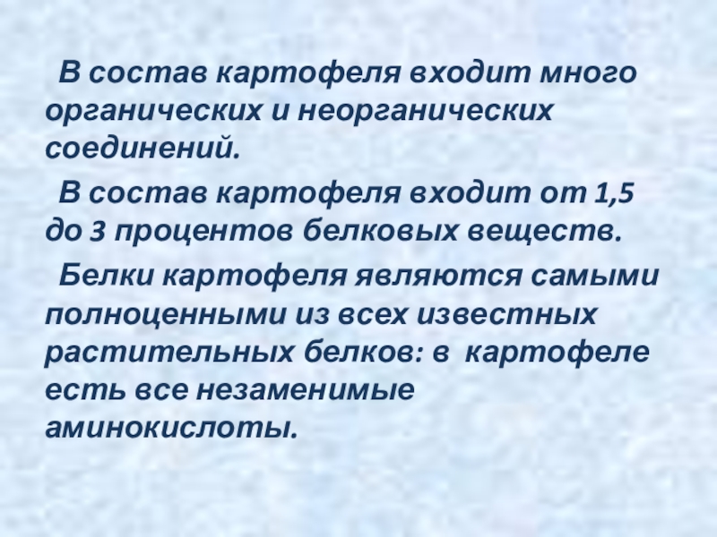 Белки картофеля являются самыми полноценными из всех известных растительных белков: в картофеле есть все незаменимые аминокислоты.
