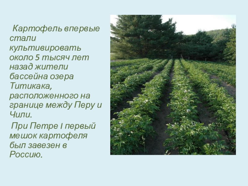 Слайд 4 Картофель впервые стали культивировать около 5 тысяч лет назад жители