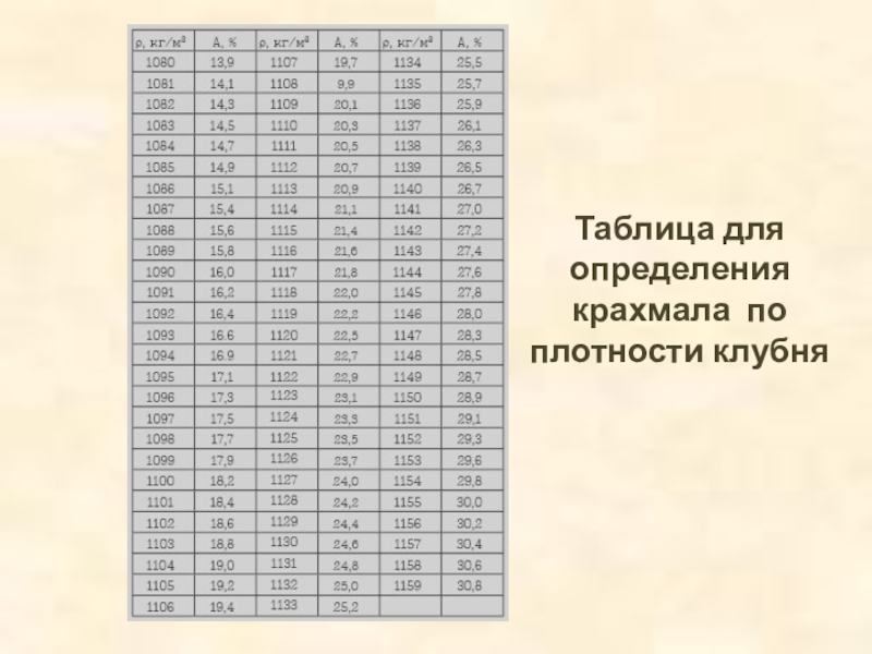 Слайд 19Таблица для определения крахмала по плотности клубня