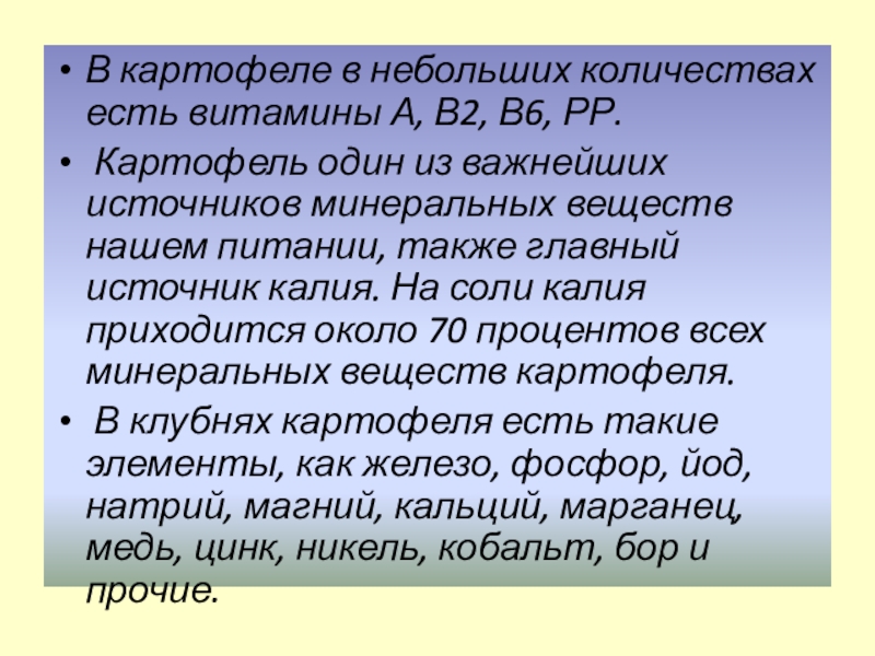 Картофель один из важнейших источников минеральных веществ нашем питании, также главный источник калия. На соли калия приходится около 70 процентов всех минеральных веществ картофеля.