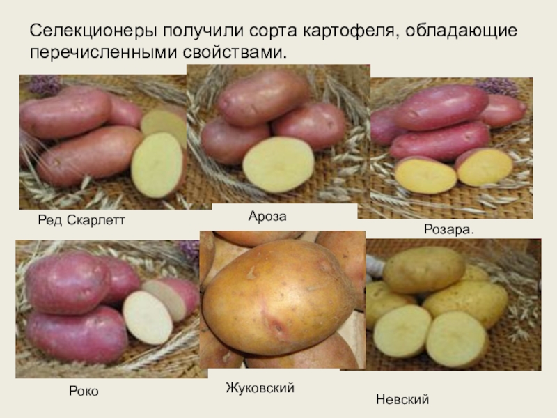Слайд 17В 5 сортах картофеля «Ароза», «Ред Скарлетт», «Роко», «Невский» и привезенный