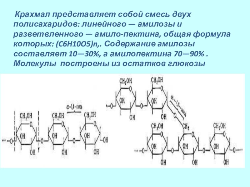 разветвленного — амило-пектина, общая формула которых: (C6H10O5)n,. Содержание амилозы составляет 10—30%, а амилопектина 70—90% .
