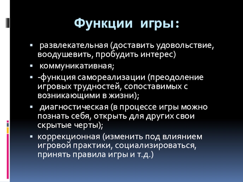 диагностическая (в процессе игры можно познать себя, открыть для других свои скрытые черты);
