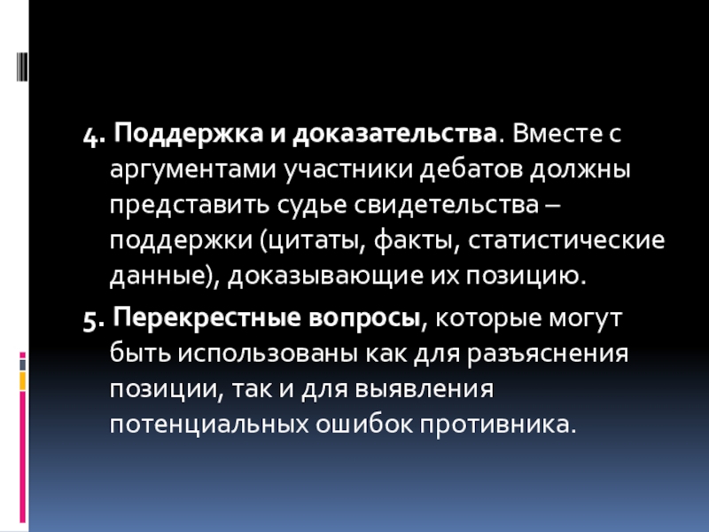 Слайд 214. Поддержка и доказательства. Вместе с аргументами участники дебатов должны представить