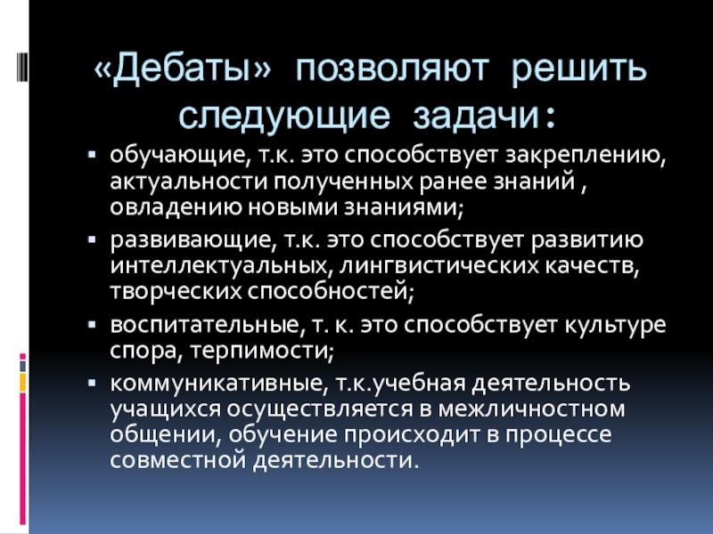 Слайд 10«Дебаты» позволяют решить следующие задачи: