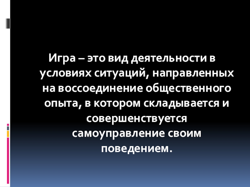 Слайд 5Игра – это вид деятельности в условиях ситуаций, направленных на воссоединение