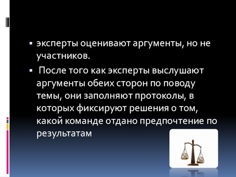 аргументы обеих сторон по поводу темы, они заполняют протоколы, в которых фиксируют решения о том, какой команде отдано предпочтение по результатам