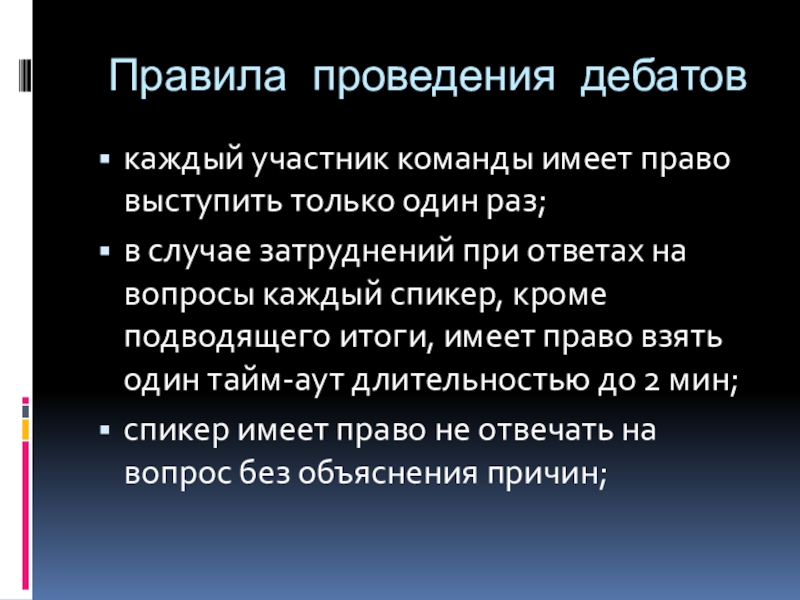 в случае затруднений при ответах на вопросы каждый спикер, кроме подводящего итоги, имеет право взять один тайм-аут длительностью до 2 мин;