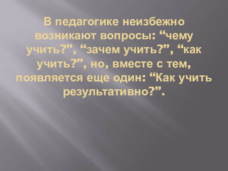 В педагогике неизбежно возникают вопросы: “чему учить?”, “зачем учить?”, “как учить?”, но, вместе с тем, появляется еще один: “Как учить результативно?”.