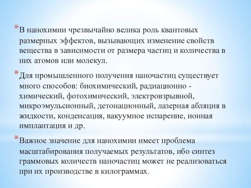 Наличие размерного эффекта, связанного с качественным изменением физико - химических свойств и реакционной способности в зависимости от количества атомов или молекул в частице, определяет специфику и особенности превращений веществ в нанохимии.