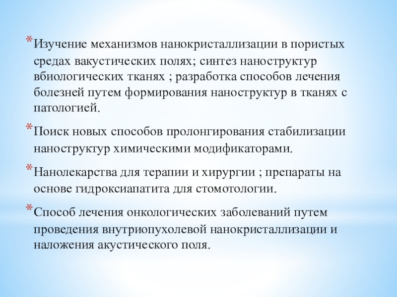 Слайд 14Изучение механизмов нанокристаллизации в пористых средах вакустических полях; синтез наноструктур вбиологических