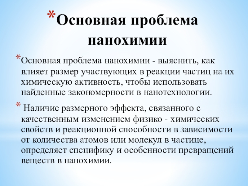 Основная проблема нанохимии - выяснить, как влияет размер участвующих