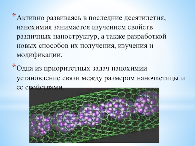 Слайд 11Активно развиваясь в последние десятилетия, нанохимия занимается изучением свойств различных наноструктур,