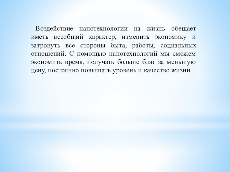 затронуть все стороны быта, работы, социальных отношений. С помощью нанотехнологий мы сможем экономить время, получать больше благ за меньшую цену, постоянно повышать уровень и качество жизни.