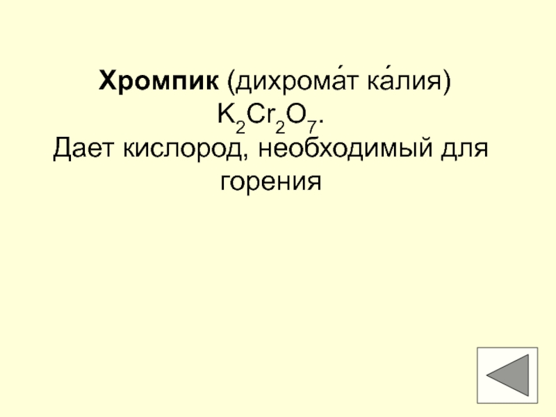 Хромпик (дихрома́т ка́лия)       K2Cr2O7. Дает кислород, необходимый для горения