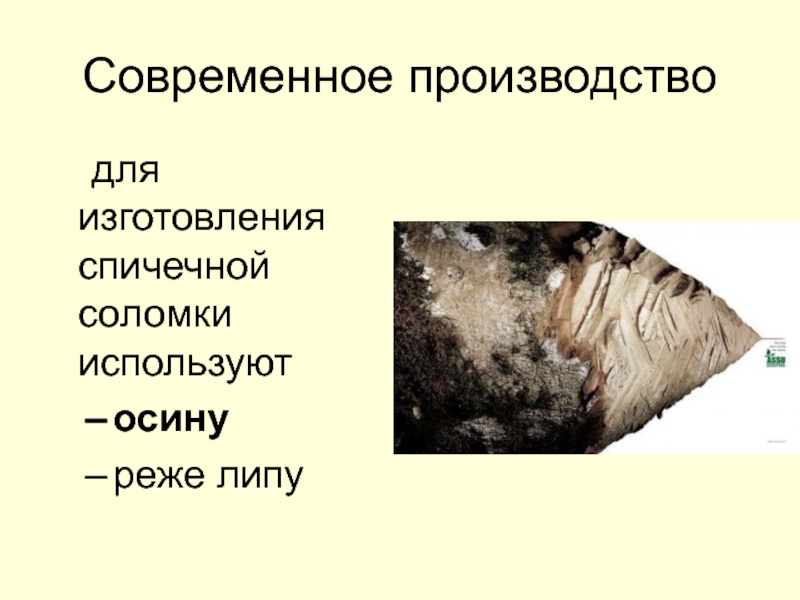 Современное производство  для изготовления спичечной соломки используют осину реже липу