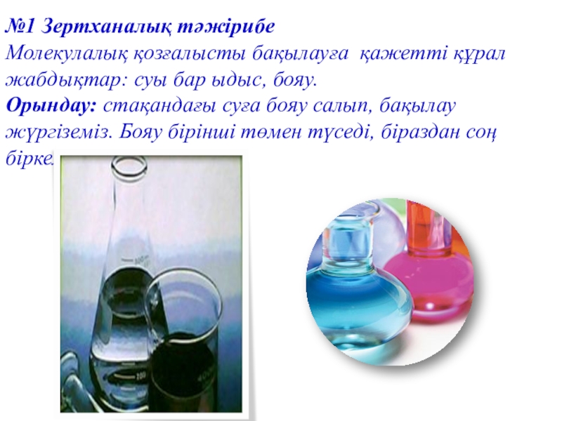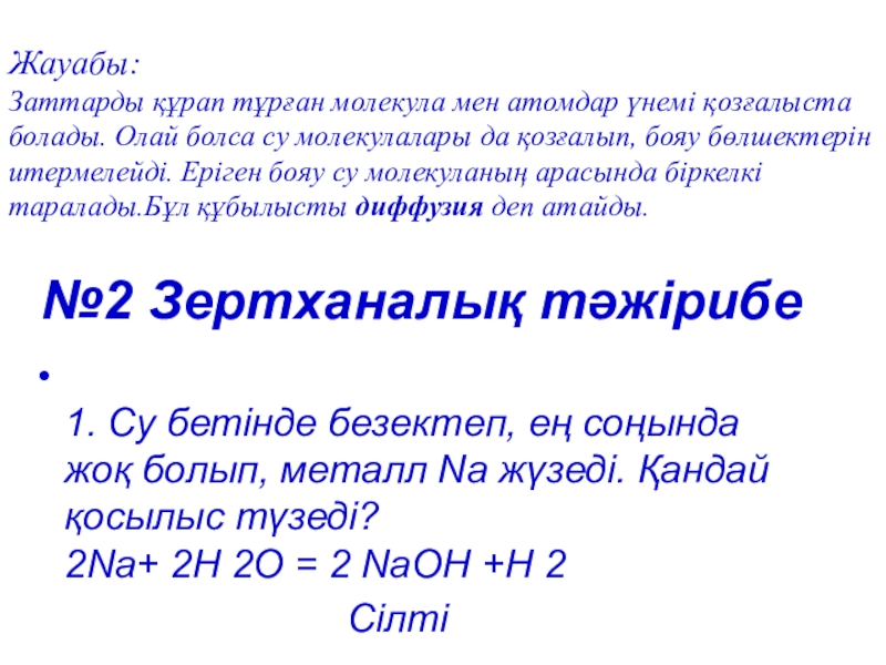 Заттарды құрап тұрған молекула мен атомдар үнемі қозғалыста болады. Олай болса су молекулалары да қозғалып, бояу бөлшектерін итермелейді. Еріген бояу су молекуланың арасында біркелкі таралады.Бұл құбылысты диффузия деп атайды.